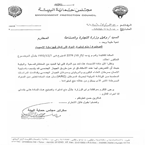 الخط الأخضر أكدت بأنه تم منع تصنيع واستخدام وتصدير وإستيراد الاسبستوس للبلاد بقرار حكومي صدر تلافي للمخاطر السرطانية التي تتسبب بها هذه المادة الخطيرة صادر عن مجلس حماية البيئة قبل إنشاء الهيئة العامة للبيئة ، ورغم ذلك تستخدمها وزارة الصحة منذ فترة طويلة في أماكن عدة في منطقة الصباح الصحية.