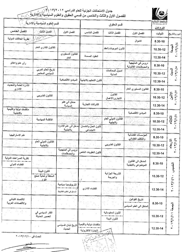 أعلنت رئيس لجنة العلاقات العامة للطالبات في الاتحاد الوطني لطلبة الكويت في لبنان فاطمة الدابي أن كلية الحقوق والعلوم السياسية والإدارية “الفرع الأول” بالجامعة اللبنانية حددت تاريخ 4 يناير 2013 موعدا لبدء الاختبارات الجزئية “منتصف الفصل الدراسي” وتستمر حتى تاريخ 11/1/2013، مشيرة إلى أنها المرة الأولى التي تجرى فيها اختبارات نصف فصلية لطلبة الحقوق والعلوم السياسية والإدارية وستكون الاختبارات حسب الجدول المرفق.