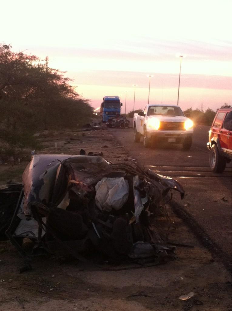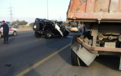 شهد طريق الملك فهد فجر اليوم حادثاً مروعاً بين شاحنة وسيارة جيب وأخرى صالون أمريكية الصنع نجم عن إصابة قائد الجيب ومرافقه فيما يرجج وفاة قائدة السيارة الصغيرة التي تقطعت إلى ثلاثة أجزاء صغيرة متناثرة.