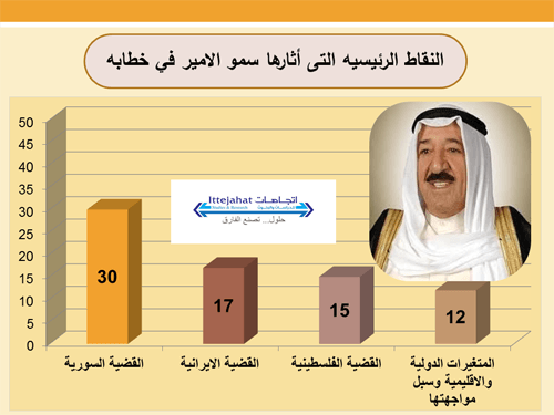 أصدر مركز اتجاهات للدراسات والبحوث تقريرا حلل فيه مضامين خطاب سمو الامير الشيخ صباح الاحمد الصباح الذي ألقاه في مؤتمر قمة دول مجلس التعاون الخليجي المقام في مملكة البحرين, معتمدا فى ذلك على ثلاث وحدات رئيسية هي (الفقرة والفكرة والكلمة) وقد واشتمل الخطاب على اربعة عشر فقرة في الثلاث الاولى تقدم فيها سموه بالشكر والامتنان لقيادات المملكة وتهنئة بعض الدول الخليجية بالأعياد الوطنية, وشكر للمولى على سلامة خادم الحرمين الشريفين, اضافة الى اخر فقرتين لأسباب مشابهة.