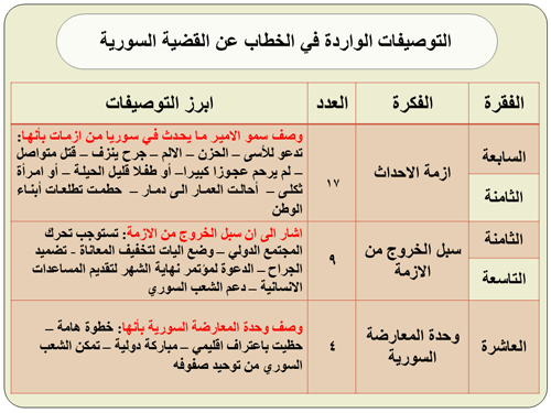 اشار اتجاهات ان هذه القضية لم تأت في فقرات الخطاب الاولى وانما جاءت فى منتصفه, الا أن كثافة التوصيفات السامية لهذه القضية والتي بلغت 30 توصيفا وامتدت لأربع فقرات كاملة, تؤكد أن القضية تعيش فى قلب وعقل سمو الامير وتظهر مدى الالم والحزن الذى يشعر به ازاء ما الت الية الاحداث في سوريا.