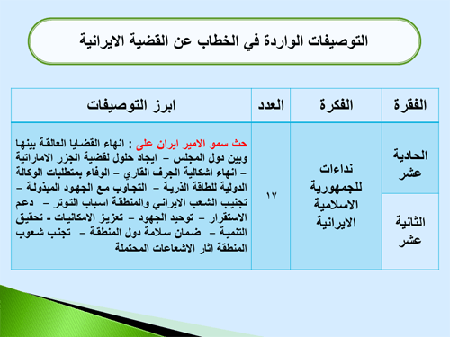 وأظهر التحليل أن الخطاب اشتمل على أربع قضايا رئيسية جاءت القضية السورية فى مقدمتها, من خلال 30 توصيفا للأزمة وسبل الخروج منها, ثم جاءت القضية الايرانية فى الترتيب الثاني بواقع 17 توصيفا حملت جميعها نداءات الى الجمهورية الاسلامية بالعمل على أمن واستقرار المنطقة, ثم القضية الفلسطينية التي حملت 9 توصيفات ايجابية لحصولها على صفة مراقب فى الامم المتحدة إضافة الى 6 توصيفات اخرى سلبيه لتداعيات العدوان الاسرائيلي الغاشم على قطاع غزة, وأخيرا جاءت المتغيرات الدولية والاقليمية في الترتيب الاخير من حيث تكرار التوصيفات المكملة لها.