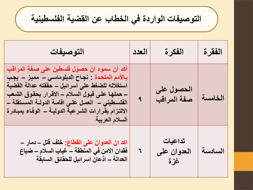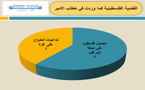 احدى القضايا “المزمنة” التى لم يغفلها سمو الامير فى معظم خطاباته باعتبارها القضية الاولى التى تجمع العرب والمسلمين, لكن الجديد فى هذه القضية هو حصول فلسطين للمرة الاولى وبعد عناء على صفة عضو مراقب فى الامم المتحدة, الامر الذى دفع سمو الامير الى الاشادة بهذه الخطوة من خلال 9 توصيفات ايجابية, اضافة الى 6 توصيفات سلبية لتداعيات العدوان الغاشم على قطاع غزة.