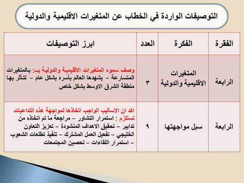 وافاد اتجاهات ان المتغيرات المتسارعة التي تشهدها الساحة الدولية والعربية حاليا كانت أحد المحاور الهامة التي استهل بها سمو الامير خطابه أمام مجلس التعاون, حيث أنها بلا شك لها تأثيراتها على دول المجلس بصفة عامة والكويت بصفة خاصة, وفي وصفه لهذا البند استخدم الامير 12 توصيفا من بينها ثلاثة توصيفات للمتغيرات وتسعة لسبل الخروج من تداعياتها السلبية.