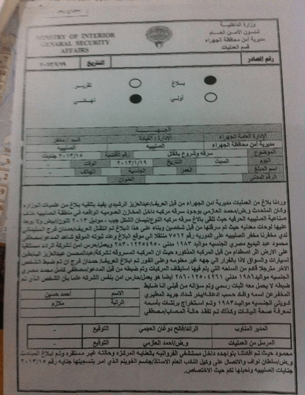 وقال مصدر امني ان بلاغا ورد الى عمليات الداخلية عن وقوع جريمة دهس وسرقة وبانتقال رجال الامن تم مشاهدة حارس مصري غارقا في دمائه وتم نقله الى المستشفي وادخل غرفة الانعاش وبسؤال مرافقه المصري ويعمل حارس امن، قال ان لصين اقتحما الكراج وسرقوا المركبة وحينما اعترض طريقه الحارس دهسوه، هذا ولدى تميشط المنطقة ضبط شاب بلا اثبات وجار معرفة لماذا كان متواجدا على مقربة من الواقعة وهل لديه معلومات عن اللصوص.جراة لصوص في المخازن العمومية.. سرقوا انفنتي 2013 ودهسوا حارس وادخلوه الانعاش