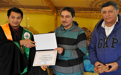 وفي نهاية البرنامج قام كل من د. محمود فخرا ود. خليفة بهبهاني بتكريم طلبة المنح الدراسية الذين تخرجوا في الفصل الدراسي الحالي.