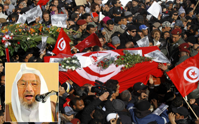 (تحديث) ندد الشيخ د. يوسف القرضاوي رئيس الاتحاد العالمي لعلماء المسلمين باغتيال المنسق العام لحزب الوطنيين الديمقراطيين التونسي، شكري بلعيد، لافتًا إلى أن الحادث عمل جبان يمثل إنذارًا شديد الخطورة لما يحتويه على إمكانات دخول دول الربيع العربي في مسلسل الاغتيالات السياسية للمعارضين.