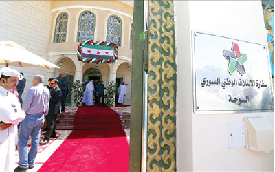 افتتح رئيس الائتلاف الوطني السوري، معاذ الخطيب، يرافقه رئيس الحكومة السورية المؤقتة، غسان هيتو، الأربعاء، سفارة الائتلاف بالعاصمة القطرية الدوحة، وذلك في خطوة هي الأولى من نوعها نحو تدعيم الاعتراف الدولي بالمعارضة السورية.