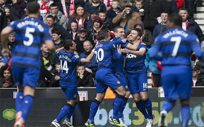 واصل فريق مانشستر يونايتد زحفه نحو لقب الدوري الإنكليزي الممتاز لكرة القدم عبر الفوز على ملعب مضيفه ستوك سيتي بهدفين نظيفين الأحد في المرحلة الثالثة والثلاثين من المسابقة.