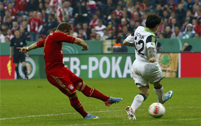 تأهل بايرن ميونيخ إلى المباراة النهائية من مسابقة كأس ألمانيا لكرة القدم بعد أن سحق ضيفه فولفسبورغ (6-1) في نصف النهائي الثلاثاء على أليانز آرينا وأمام 71 ألف متفرج.
