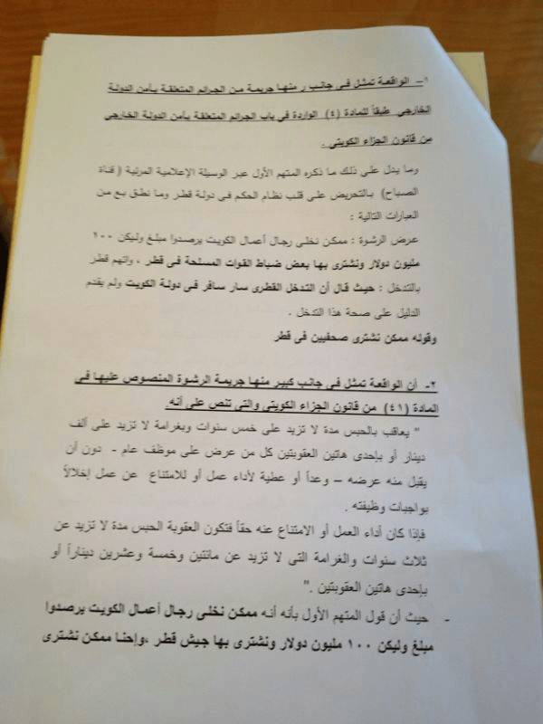 وأكد المحامي القطري أن الواقعة تمثل جريمة من جرائم أمن الدولة الخارجية بالإضافة إلى جريمة رشوة.