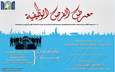 تحت رعاية وحضور مدير فرع الكويت الدكتور نايف إبجاد المطيري تدشن الجامعة العربية المفتوحة فرع الكويت أول معرض وظيفي لها يوم الأحد والاثنين الموافق 5-6 مايو 2013 الجاري من الساعة العاشرة صباحا ولغاية الساعة السادسة مساء في صالة المقر الرئيس تحت عنوان ” معرض الفرص الوظيفية ) وبتعاون مشترك بين كل من قسم العلاقات العامة والإعلام وقسم القبول والتسجيل ( مكتب الخريجين ) وقسم اشؤون الطلبة ( مكتب التوجية والإرشاد الوظيفي ) وبمشاركة العديد من شركات القطاع الخاص المحلية التي تفضلت مشكورة مشاركتنا في هذا المعرض.