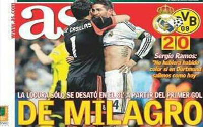أبدت الصحف الإسبانية الأربعاء أسفها وحزنها لخروج ريال مدريد الإسباني من الدور قبل النهائي لدوري أبطال أوروبا لكرة القدم وأكدت على “الحظ العاثر” الذي لازم الفريق و”الكبرياء” الذي اتسم به أداء الفريق الملكي أمام بوروسيا دورتموند الألماني الثلاثاء في مباراة الإياب التي انتهت لصالح الريال 2- صفر.