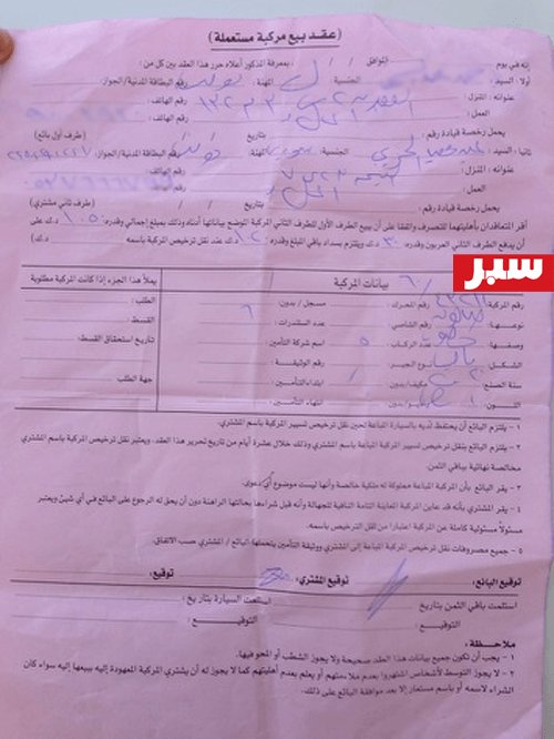 وأضافت المصادر بأن ورقة المبايعة التي يتم تزويرها وضعت لأجل حماية حقوق البائع والمشتري في حال حدوث أي مشكله خلال عملية البيع والشراء، لذلك قامت وزارة التجارة بفرض رسوم رمزية لختم تلك الورقة لضمان سلامتها، أما اليوم فالورقة المزوّرة يتم تداولها بشكل علني وسافر.