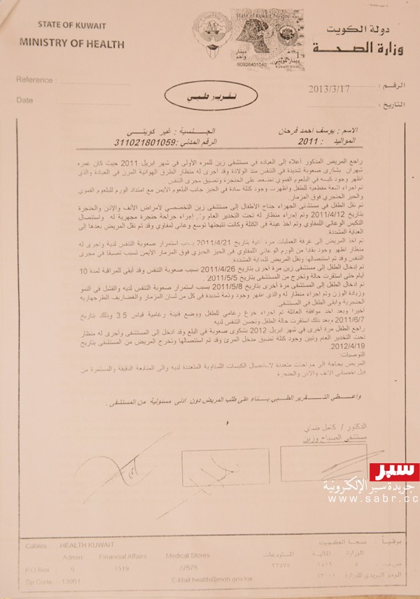 وأضاف: “فتحت ملف بإعانة المرضى، وعندما أتيتهم عند ذهابي للهند أعطوني (500) دينار.. والحالات المشابهة لأبني يوسف فقط 3 حالات شديدة الخطورة في الكويت.. الحالتان لأطفال (كويتيين)، وأحدهم سيذهب إلى أميركا وأنا الثالثة فقط”.