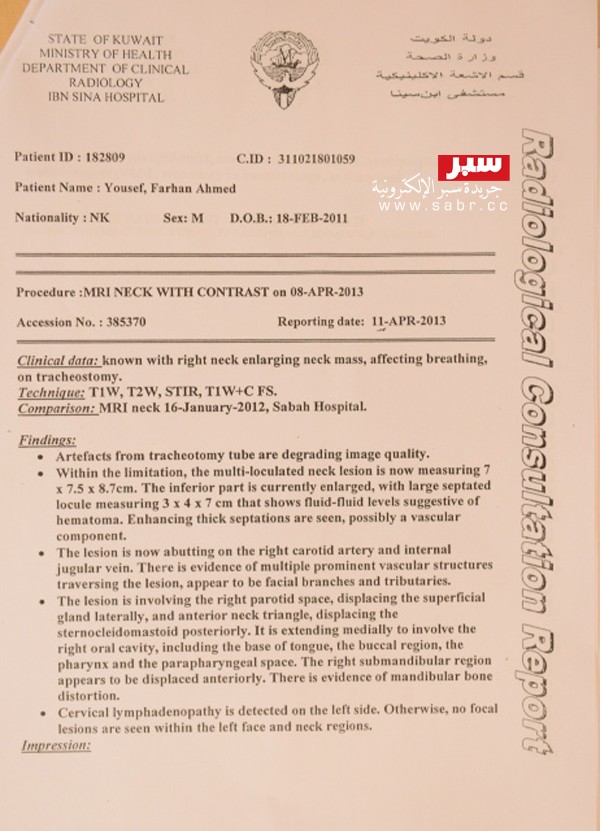 وبيّن والد الطفل رأي الأطباء.. بقوله: “الدكاترة مثل (د.حسين الشمري و د. باسل حمود الصباح و د. هشام بورزق) قالوا بأن لا حل في الكويت.. وضاعت مني الأيام وأنا (أحوس) بين المستشفيات ولم أجد سوى (الإهمال) والتأجيل والحل الذي يتلقاه ابني (يوسف) فقط في (شفط الماء) بين كل فترة وهو ليس بالحل.