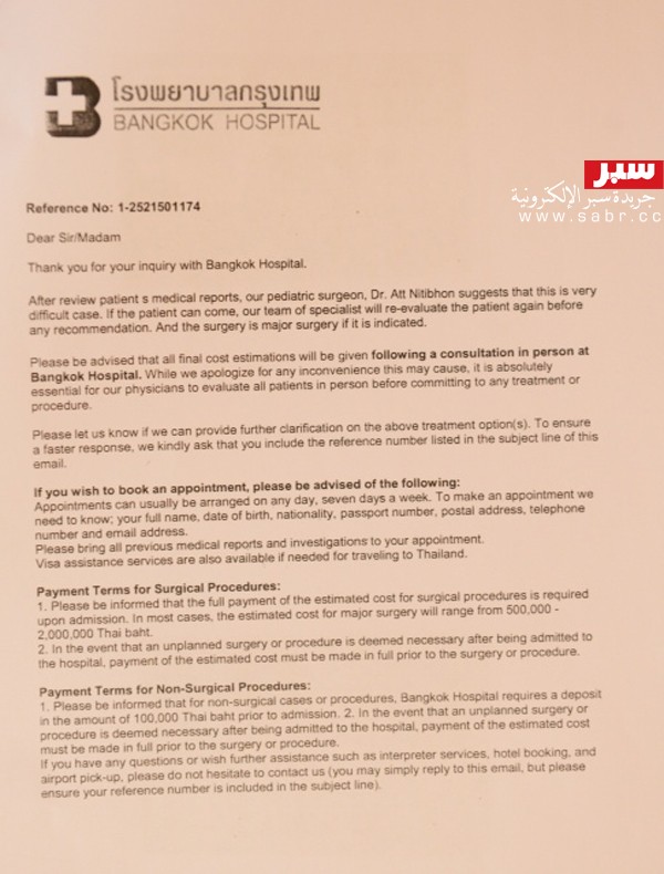 كما أنه قال: “راسلت بعض المستشفيات والمستشفى الأميركي في تايلند، وقال أن العلاج متوفّر، وأرسل لنا التقارير.. ولكن فترة العلاج طويلة، وكلفة العلاج عالية لشخص مثل حالتي”.