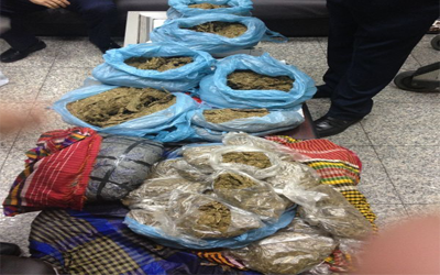 ضبط رجال جمارك المطار وافداً آسيوي كان قادماً من دكا وبحوزته 10 كيلو من مادة الماريجوانا بعد أن اشتبه به مسؤول الزام مبارك القحطاني.