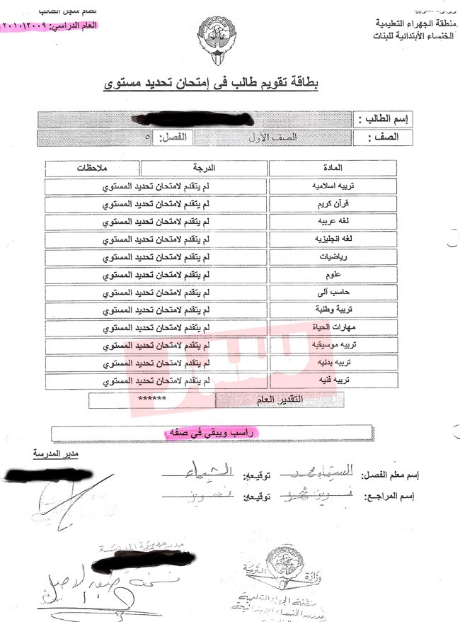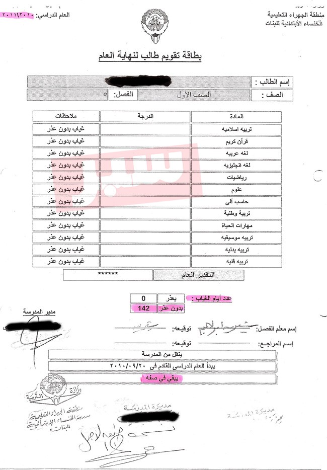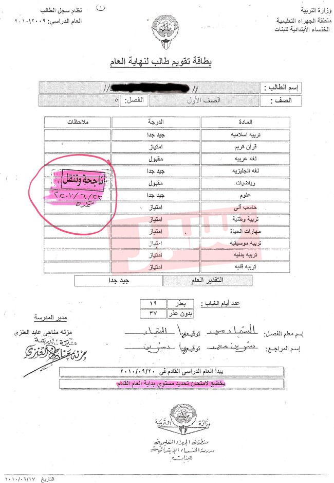 وفي تفاصيل الخبر.. فقد حصلت ((سبر)) على مجموعة من المخاطبات والكتب الرسمية بين كل من إدارة المدرسة والمسؤولين في منطقة الجهراء التعليمية بخصوص “رسوب” الطالبة وبقائها في نفس المرحلة، بسبب تغيّبها في السنة الأولى، وكتاب آخر في العام التالي يؤكّد على تغيّبها طوال العام الدراسي، وذلك لتواجدها خارج البلاد، الأمر الذي حدى بإدارة المدرسة إخلاء مسؤوليتها ومخاطبة الجهات المسؤولة للتأكيد على أن الطالبة كانت راسبة، ولا يمكن أن يتم اعتماد قبولها في الصف الثالث الابتدائي دون أن تكون الطالبة قد قامت بالانتهاء من تلك المرحلة، الأمر الذي يؤكد لنا وللقارئ وجود شبهات وأخطاء إدارية قد تم ارتكابها لطمطمة ما حدث.