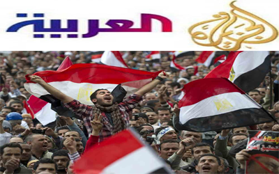 من جهته، يقول محمد الوافي اختصاصي الإعلام العربي في جامعة السوربون في باريس إن “الجزيرة والعريية قامتا بتغطية أحداث مصر بشكل متعارض تماما”. وفي حين كانت العربية تبث مباشرة تظاهرة المعارضة في ميدان التحرير، قسمت الجزيرة شاشتها قسمين لبث صور عن مسيرة مؤيدة له في ميدان آخر في القاهرة. وبينما وصفت الجزيرة قرار الجيش المصري عزل مرسي بأنه “انقلاب على الشرعية” رحبت العربية بتدخل الجيش وأطلقت شعار “الثورة الثانية”.