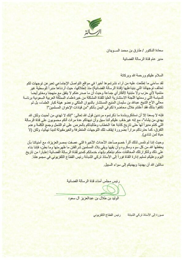 وقال الوليد بن طلال من حسابه على التويتر: “لا مكان لأي إخواني في مجموعتنا. مرفق اقالة الإخواني (طارق السويدان) الذي اعترف بإنتمائه للحركة الإخوانية الإرهابية”.
