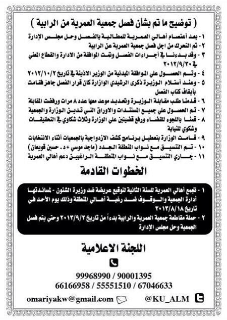 اعتصم عدد من أهالي منطقة العمرية أمام الجمعية احتجاجا على عدم توزيع أرباح خلال السنوات العشرة الماضية، مطالبين بفصل وحل مجلس الإدارة والتحرك من اجل فصل جمعية العمرية عن الرابية، ويهدف المعتصمون إلى توقيع عريضة ضد وزيرة الشؤون لدعمها إدارة الجمعية والعمل على مقاطعة جمعية الرابية والعمرية ابتداء من تاريخ 03/09/2013.