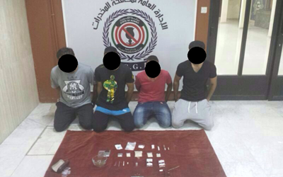 القت الإدارة العامة لمكافحة المخدرات إدارة المكافحة المحليةالقبض على تشكيل عصابي مكون من 4 أشخاص بحوزتهم مواد مخدرة وسلاح ناري وطلقات، حيث وردت معلومات إلى الإدارة العامة لمكافحة المخدرات باستحداث بعض مروجي المخدرات لطريقة جديدة ومبتكرة باستخدام الكلاب البوليسية لحراستهم وإعاقة ضبطهم وبعد التأكد من صحة تلك المعلومات تم إستصدار الإذن القانوني اللازم لضبطهم حيث قامت قوة من إدارة المكافحة المحلية بالتنسيق مع إدارة الأثر بضبط المتهم الأول بمسكنه حيث كان برفقته المتهم الثاني وبتفتيش المسكن تم العثور على مايقارب 10 جرام من مادة الآيس واصبع من الحشيش وسلاح ناري نوع مسدس وطلقات نارية كما تم السيطرة على الكلاب البوليسية الموجودة داخل الشقة، حيث إعترفا بانهم يحصلون على تلك المخدرات من المتهم الثالث والذي تم ضبطه وبحوزته عدد 70 جرام من مادة الهيرويين وعدد 50 جراما من مادة الايس وبدوره اعترف على المتهم الرابع والذي تم ضبطه وعثر بحوزته على عدد 20 جراما من مادة الايس المخدرة .