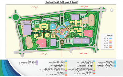 وأشار د.الحداد بان مباني الكلية تنقسم إلى قسمين ,القسم الأول يخصص للطالبات و يحتوي على المبنى العام و الكافتيريا والمبنى الأكاديمي العام ومبنى كلية التربية والأقسام العلمية (العلوم الإنسانية – قسم العلوم والتكنولوجيا – قسم الفنون التطبيقية والموسيقى ) مجمع التربية البدنية (ويضم مبنى الدعم الأكاديمي والمجمع التربية البدنية /المباني الرياضية( وسكن الطالبات ومواقف سيارات متعددة الطوابق ومدرج خارجي للألعاب الرياضية.