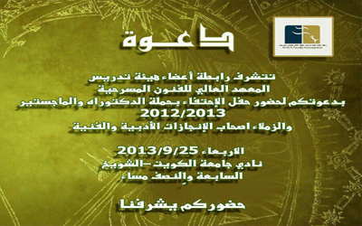 تدعو رابطة أعضاء هيئة تدريس المعهد العالي للفنون المسرحية لحضور الإحتفال بحملة الدكتوراه والماجستير 2012/2013 وأصحاب الإنجازات الأدبية والفنية، وذلك يوم غد الأربعاء في نادي جامعة الكويت – الشويخ في الساعة السابعة والنصف مساء.