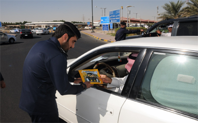 في إطار سلسلة الحملات التوعوية المرورية التي تقوم بها أجهزة وزارة الداخلية بمناسبة بدء العام الدراسي الجديد لتوعية وارشاد المشاة وقائدي المركبات من المواطنين والمقيمين، قام فريق عمل صباح اليوم الخميس الموافق 26/9/2013م ضم كل من رئيس قسم تحقيق مخالفات مرور الأحمدي بالإنابة المقدم/ ماجد ملفي الديحاني، وعدد من ضباط وأفراد القسم بحملة توعوية مرورية  في نطاق محافظة الأحمدي، شملت توزيع بروشورات مرورية توعوية على المواطنين والوافدين وقائدي المركبات لحثهم على ضرورة الالتزام بقواعد وآداب المرور و لعدم الوقوع في المخالفات وذلك تنفيذاً لتوجيهات وكيل وزارة الداخلية المساعد لشئون المرور اللواء/ عبدالفتاح العلي، وبتعليمات من مدير إدارة تحقيق مخالفات المرور العقيد محسن المخيال، ومساعــــده العقيــــد/ حسين المطيري.