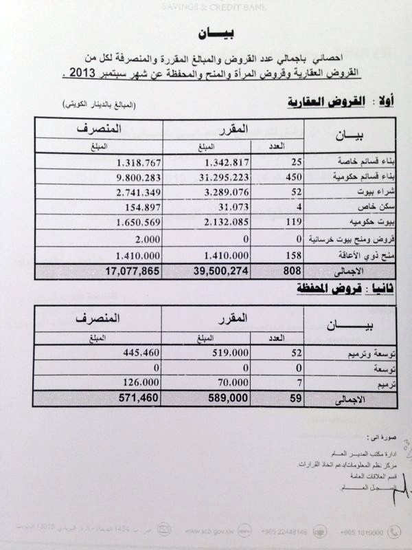 أكد بنك التسليف والادخار في بيان له أن إجمالي المبلغ المنصرف من القروض العقارية لشهر سبتمبر 2013 بلغ 17 مليوناً و77 ألفاً و865 ديناراً (من أصل 39.500.274 دينار مقررة) موزعة على بناء قسائم خاصة وقسائم حكومية وشراء بيوت وسكن خاص وبيوت حكومية بالإضافة إلى قروض ومنح بيوت حكومية ومنح ذوي الإعاقة.