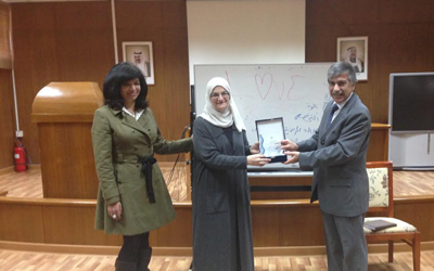 وفي الختام قام عميد الكلية أ.د جاسم الأنصاري و رئيس قسم صحة الفم والأسنان د.سمية دشتي بتقديم الدرع التذكاري شاكرين لها اقامة مثل اللقاءات التي تسهم في زيادة التوعية و الثقافة للمجتمع.