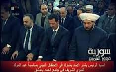 شارك رئيس النظام السوري بشار الاسد في احياء ذكرى المولد النبوي الشريف في احد مساجد دمشق، بحسب ما أظهرت لقطات بثها التلفزيون الرسمي السوري، في وقت تواصلت عمليات القصف العشوائي التي تشنها قواته على الأحياء السكنية في مختلف القرى والمدن في المحافظات السورية موقعة العشرات من الضحايا.