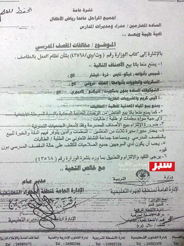 وفي التفاصيل فقد علمت ((سبر)) أن إحدى الشركات التي تم التعاقد معها لتوفير وجبات الأغذية لطلبة المدارس ، تقوم بشكل يومي وعلى مرئى المسؤولين بإدخال جميع الأغذية والعينات التي تم حضرها ومنعها سابقا بعذر أنها غير صحية للأطفال وتمت على خلفيتها محاسبة العديد من من مدراء ومديرات المدارس وكسر هممهم ومحو كل ماضيهم الحافل بالإنجازات والعطاء فقط لأجل كيس شبس وعلبة عصير مخالفة بيعت بالمقصف ، ها هي تدخل اليوم بطريقه شرعية وبمباركة وزارية مطبقين بذلك (( أبوي ما يقدر إلا على أمي )) .