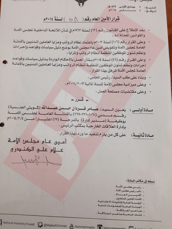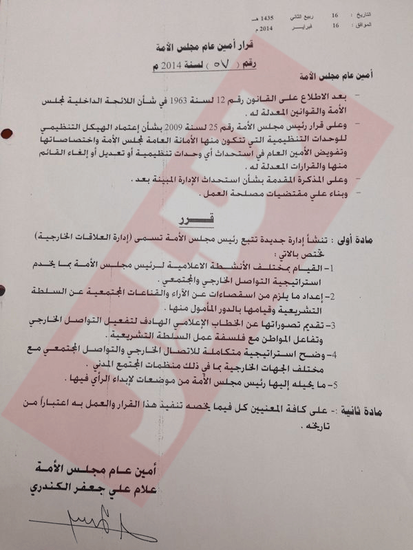 حصلت ((سبر)) على وثيقة تحمل قرارات جديدة صادرة من أمانة مجلس الأمة، حيث قام الرئيس “مرزوق الغانم” باستحداث إدارة جديدة للاهتمام بعلاقاته الخارجية.