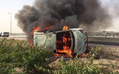 نجا مواطن بأعجوبة صباح اليوم بعد حادث انقلاب مركبته واشتعالها على طريق الدائري السادس.
