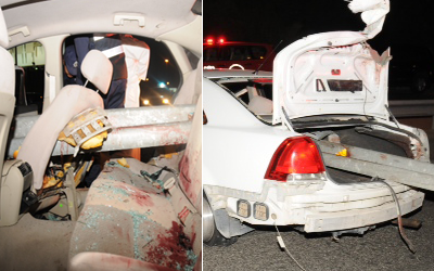 وهرعت للتعامل معه فرقة انقاذ مركز اطفاء الشهداء بقيادة النقيب /بدر ناصر الرشيد والملازم اول /عبدالله الحرز والملازم اول/يوسف مراد وعند وصول رجال الاطفاء تبين ان السيارة ارتطمت بالحاجز الحديدي الفاصل بين الخط السريع والطريق الفرعي ودخول الحاجز الحديدي على الاشخاص بالسيارة مما ادى الي وفاة شخص واصابه رجل شخص اخر واخر بكدمات بسيطة.