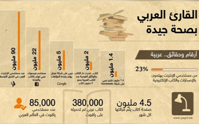 أظهرت نشرات دولية صادرة عن مواقع إلكترونية عالمية، مدى تحسن علاقة القارئ العربي بالكتب في السنوات الأخيرة، حيث أشارت شبكة غوغل إلى أن 5 ملايين مستخدم عربي (من مستخدمي شبكة غوغل) يهتمون بقراءة المؤلفات، في حين قدر فيسبوك عدد مستخدميه الذين يهتمون بقراءة الكتب من العرب بنحو 22 مليون مستخدم.