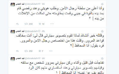 وأضاف العجمي: “وقلتله خير إن شاء الله لماذا تقوم بتصوير سيارتي قال لي: أنت مخالف قواعد المرور. وقلت هذا من اختصاص رجال الامن والمرور. فرد يقول: أنا المحافظ وأنا أعلى من سلطة رجال الأمن. وطلب هويتي وعند رفضي قام بمد يده بالقوة في جيبي وقمت بمقاومته حتى تمكنت من الانفلات من يده”.