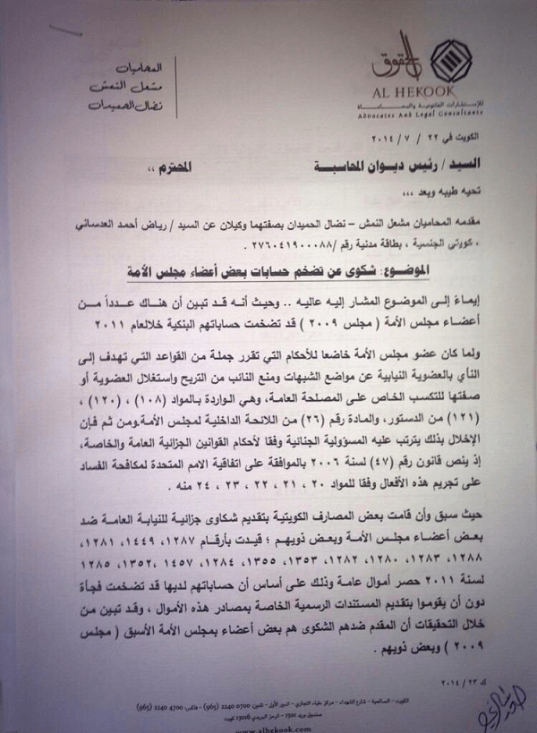 آخر الأخبار جرائم وقضايا “الجمارك” تضبط 29 ألف علبة مشروبات كحولية قادمة من دولة آسيوية في ميناء الشويخ 9 يونيو، 2024 محليات ممثلة عن دولة الكويت الطبيبة الكويتية أسماء الكندري تشارك في المؤتمر العالمي للمناظير في إيطاليا 8 يونيو، 2024 محليات “الصحة”: اكتمال وصول فريق الخدمات الطبية ببعثة الحج الكويتية لمكة المكرمة 8 يونيو، 2024 محليات “الصحة” تحدد 8 مراكز للصحة المدرسية لاستقبال الطلبة المبتعثين 8 يونيو، 2024 عربي وعالمي “الصحة العالمية”: تسجيل أول وفاة لشخص مصاب بـ«أنفلونزا الطيور» 7 يونيو، 2024 برلمان العدساني يتقدم ببلاغ إلى ديوان المحاسبة بشأن قضية الإيداعات المليونية المحرر البرلماني23 يوليو، 2014أضف تعليق1 دقائق أعلن النائب السابق رياض العدساني تقديمه اليوم بلاغا إلى ديوان المحاسبة بشأن قضية الإيداعات المليونية. ونشر العدساني من حسابه على التويتر 4 صور عن البلاغ يتضمن كافة البيانات، وهي كالتالي: من الممكن أن يعجبك برلمان عبدالله فهاد يطعن أمام “الدستورية” في نتيجة انتخابات مجلس الأمة 2024 بـ”الرابعة” آراؤهم • برلمان “حل” و”انتخابات” .. ولكن لا قرار لايقاف “شبهات التنفيع والواسطة”؟! برلمان 37 مرشحا ومرشحة في اليوم العاشر والأخير من فتح باب الترشح لانتخابات مجلس الأمة (أمة 2024) برلمان • محليات 17 مرشحا في اليوم التاسع من فتح باب الترشح لانتخابات مجلس الأمة (أمة 2024) برلمان 23 مرشحا في اليوم السادس من فتح باب الترشح لانتخابات مجلس الأمة (أمة 2024) برلمان 32 مرشحا ومرشحة في اليوم الثالث من فتح باب الترشح لانتخابات مجلس الأمة (أمة 2024) أضف تعليق أضغط هنا لإضافة تعليق إلغاء الردالتعليقالاسم البريد الإلكتروني الموقع الإلكتروني Δ هذا الموقع يستخدم خدمة أكيسميت للتقليل من البريد المزعجة. اعرف المزيد عن كيفية التعامل مع بيانات التعليقات الخاصة بك processed.