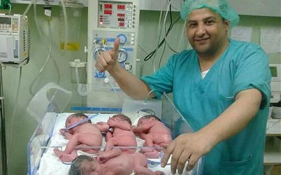 نشر طبيب في مستشفى الشفاء في قطاع غزة اليوم الخميس صورة على حسابه الخاص على موقع تويتر يظهر من خلالها أربعة توائم ولدوا حديثاً.