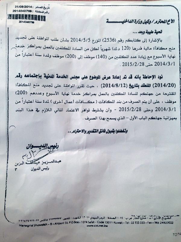 وذكر العنزي أن الخليفة كلف الادارة العامة للشؤون المالية بسرعة إنجاز الاجراءات الرسمية وتحويل المبالغ لحسابات الموظفين حيث تم الانتهاء من كافات الإجراءات اللازمة، موضحاً أن المبلغ المستحق هو 120 ديناراً اعتباراً من 1 / 3 /2014 وستكون هذه المبالغ في حسابات الموظفين خلال أربعة أيام.