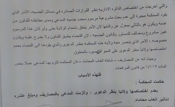 (تحديث) أكدت المحكمة الإدارية أن مرسوم سحب جنسية أحمد الجبر غير مشروع ومخالف للدستور وقانون الجنسية، ولكنها بينت عدم اختصاصها وهو بالتالي بمعزل عن رقابتها لأن الأمر يتعلق بانعدام الولاية، لأن القضاء يطبق القانون ولا يخرج عليه ويلتزم بنصوصه، الأمر الذي ينحسر معه ولاية هذه المحكمة بنظر الدعوى والذي يقودها إلى القضاء بعدم اختصاصها ولائياً بنظر الدعوى.