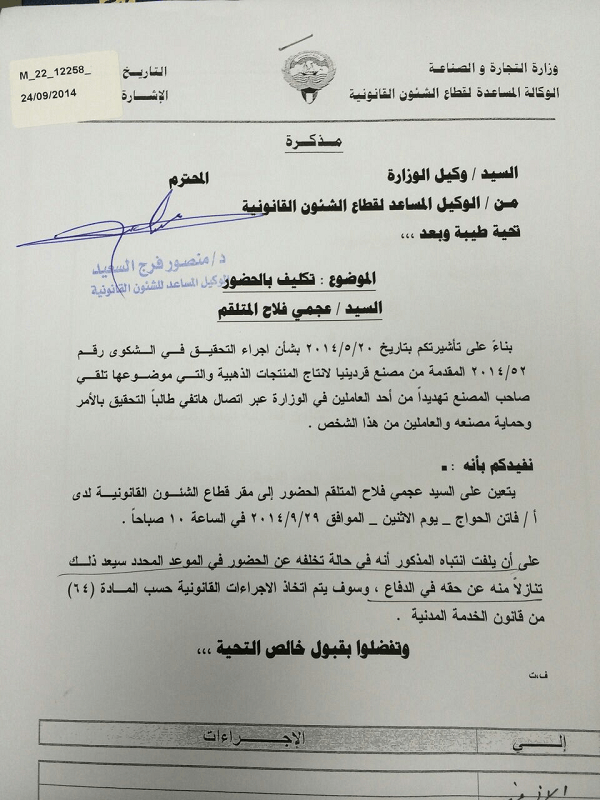 وأكد السميط بأن على وكيل قطاع القانونية بوزارة التجارة ان المنظمة النقابية تعمل من أجل حماية حقوق الموظفين والدفاع عن مصالحهم من اجل المصلحة العامة للوزارة، وأن على الوكيل بدلاً من استدعاء رئيس المنظمة النقابية ان يقوم بالتحقيق بجميع المخالفات الموجودة بالوزارة والنظر بتظلمات الموظفين واعداد تقارير بالتجاوزات التي يقوم بها بعض القياديين داخل الوزارة ولكن للأسف الشديد وكيل القطاع غير قادر على تصحيح هذه التجاوزات التي مضى عليها الدهر وهي حبيسة الادراج واهتمامه الاول وشغله الشاغل المهمات الرسمية والدورات الخارجية فقط.