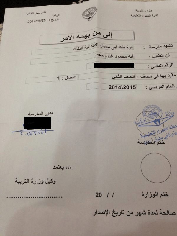 ومن تلك الأخطاء ما تعرضت له الطالبة “آية” بعد أن نجحت وحصلت على شهادة ناجح وتنقل للصف الثاني ويتم تسجيلها بالمرحلة التي تنقل اليها، تفاجأ هي وذويها بعد مضي ما يقارب الشهر من الدوام اليومي واستلامها للكتب المدرسية وتأقلمها مع زميلاتها الجدد في الصف الثاني الابتدائي، بتوجيه إدارة المدرسة السابقة لها بكتاب رسمي يفيد بأن الطالبة راسبة وسوف تبقى للإعادة في صفها السابق “الأول ابتدائي” وذلك لورود خطأ إجرائي من قبل الإدارة.