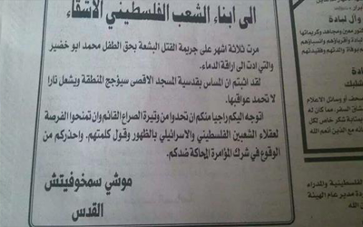 تفاجأ الفلسطينيون بإعلان في صحيفة القدس الفلسطينية، يرجوهم بضرورة تهدئة الأوضاع وإعطاء الفرصة لمن أسماهم بـ”عقلاء الشعبين” بالظهور وقول كلمتهم، ووقع الإعلان باسم إسرائيلي يدعى “موشيه سمخوفتش”.