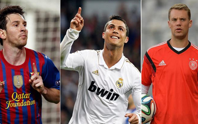 لم تشهد اللائحة النهائية للمرشحين لجائزة الاتحاد الدولي لكرة القدم (فيفا) الكرة الذهبية لأفضل لاعب في العالم للعام 2014 مفاجآت، إذ انحصر السباق وكما كان متوقعا بين الثلاثي البرتغالي كريستيانو رونالدو وغريمه الأرجنتيني ليونيل ميسي والحارس الألماني مانويل نوير.