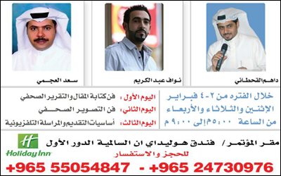 تقيم شركة جلوبال كورسيس لتنظيم المعارض والمؤتمرات، المؤتمر التدريبي الأول لعام 2015 بعنوان “أساسيات فن الصحافة والإعلام” وذلك خلال الفترة من 2 إلى 4 فبراير في فندق هوليدي ان السالمية الدور الاول.