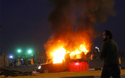 وأفاد شهود عيان بقيام جماهير الزمالك بإشعال النيران في سيارات تابعة للشرطة أمام الملعب بعد تعدي الأمن عليهم.