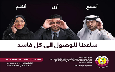 وذلك يتضح في الحملة الإعلامية التي بدأها مكتب مكافحة الفساد في النيابة العامة القطرية لـ “المساعدة في الوصول إلى كل فاسد” من خلال حملة إعلانية في الصحف والمجلات ووسائل الإعلام القطرية بعنوان: “أَسمع.. أَرى.. أَتكلّم”.